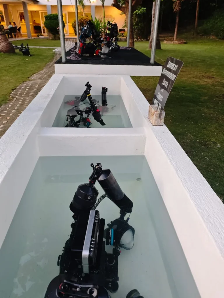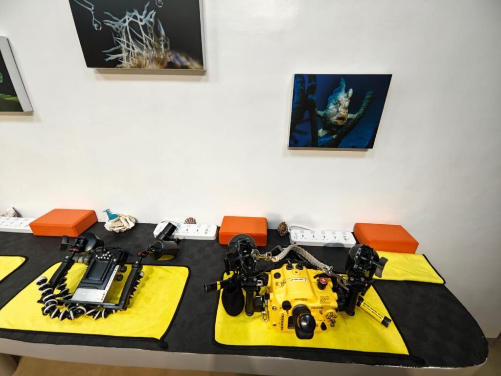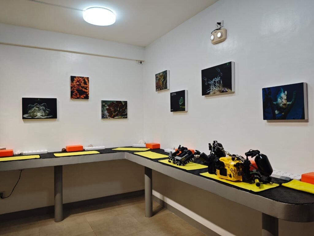 Our ground floor camera hub is the heart of the resort for underwater photographers. It is the perfect place to service your camera, change lenses and diopters, and charge all your batteries between dives. Moreover, the camera hub showcases the best underwater macro photography images taken around Romblon on its walls — making it an inspiring meeting place where guests share tips, review images, and discuss the day’s macro finds together.