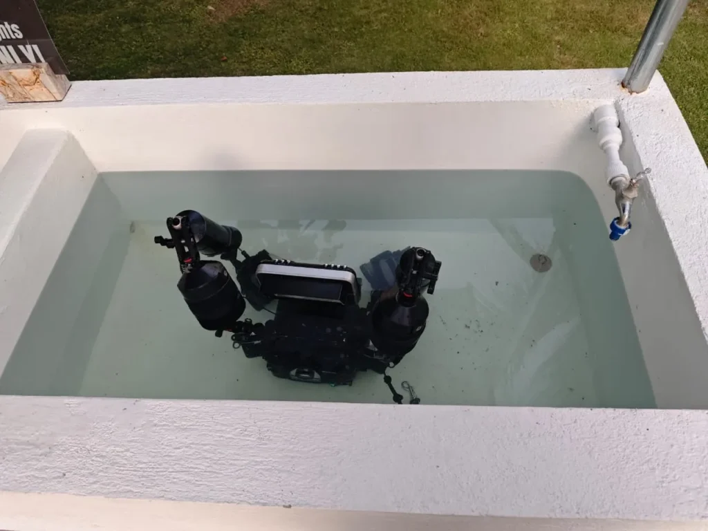 Our dedicated camera cleaning station features two large rinse tanks outside, allowing you to safely rinse your housing, strobes, and video lights after every dive. Compressed air is available to blow-dry your camera equipment quickly and thoroughly before opening your housing — keeping your gear safe and ready for the next dive.